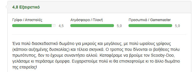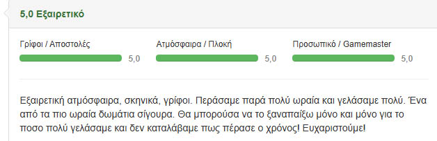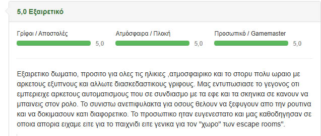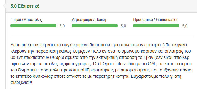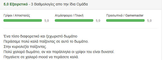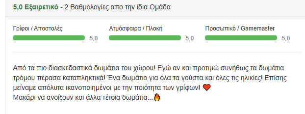 “Προσωπικα απο τα πιο φαν γριφοδωματια που εχω επισκεφθει 🙂 και την πρωτη και τη δευτερη φορα νομιζω εκνευρισα τους συμπαικτες μου καθως δεν μπορουσα να συγκεντρωθω στην επιλυση των γριφων… αντιθετα .. οι “αντιπερισπασμοι” του δωματιου με κερδισαν πληρως 😛 Δωματιο στο οποιο εκανα ” ποδαρικο” εν αγνοια μου καθως ημουν η πρωτη επισιμη κρατηση.. χαιρομαι παρα πολυ που με ” κερδισε” και τη στη δευτρεη επισκεψη… Ελπιζω να τριτωσει 😀 Να πατε 🙂“